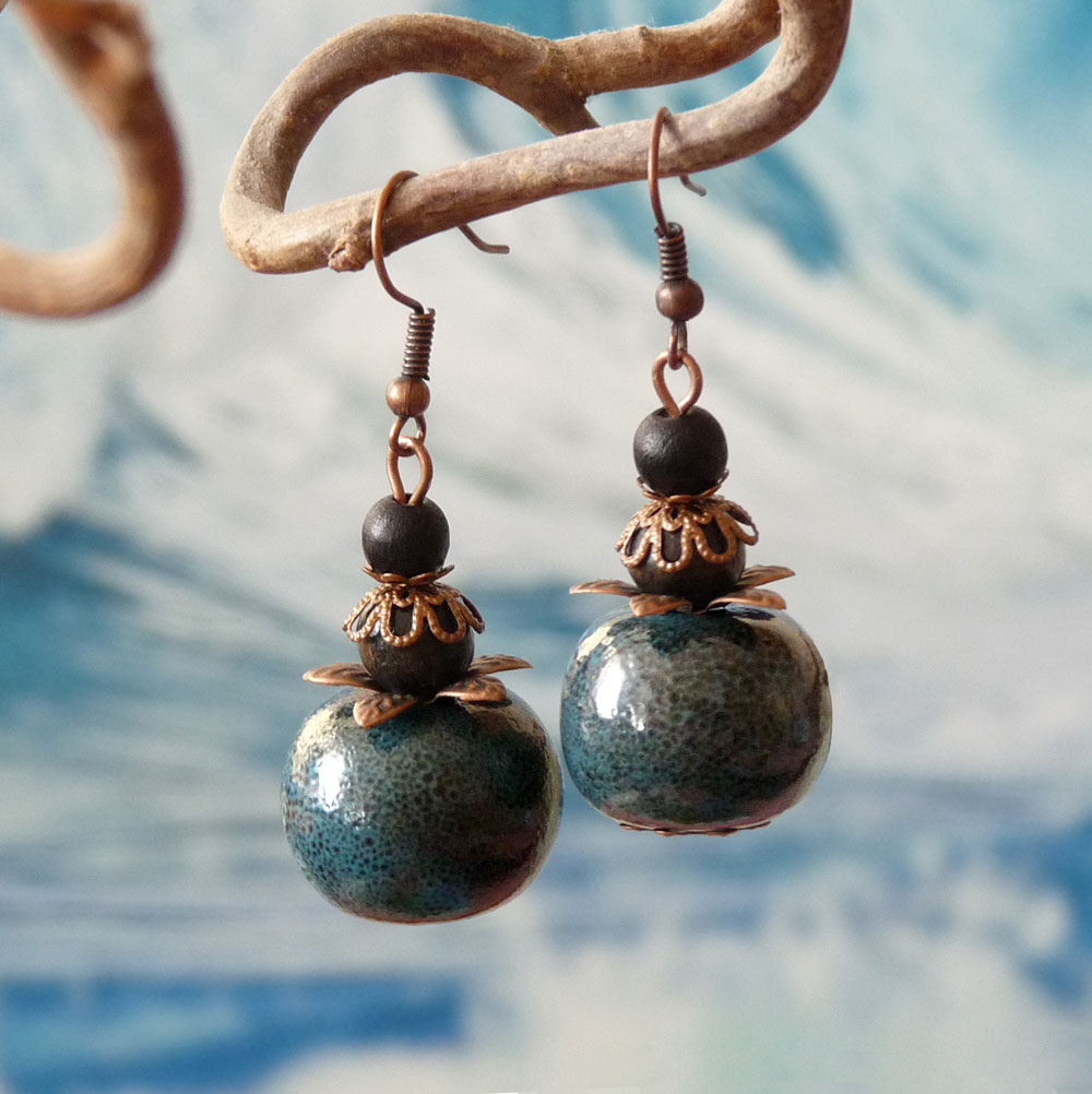 Dominantu náušnic tvoří nádherné keramické soudky, doplněné o dřevěné korálky a květinové kaplíky