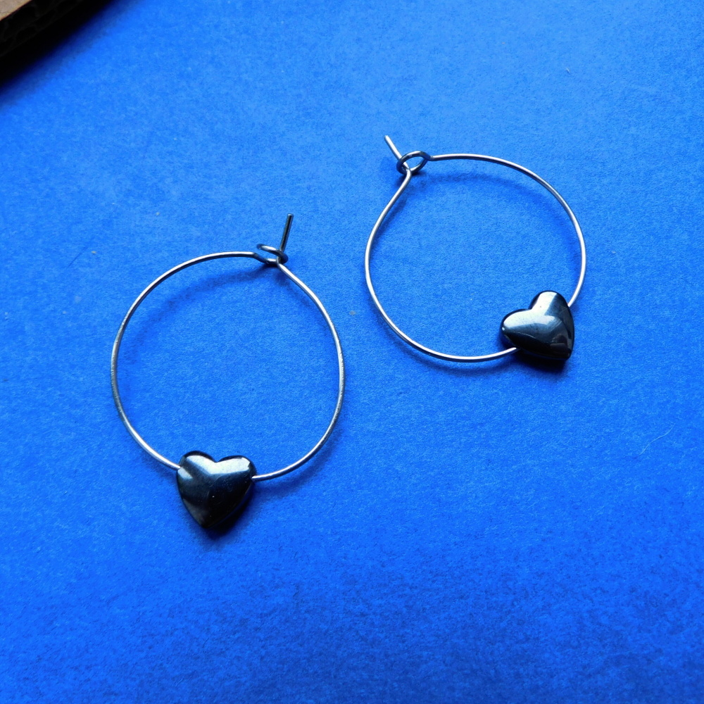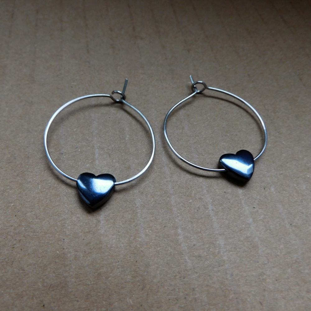 Naušnice kroužky z nerezu , navlečené malé hematitové srdíčko....