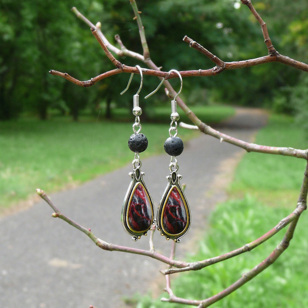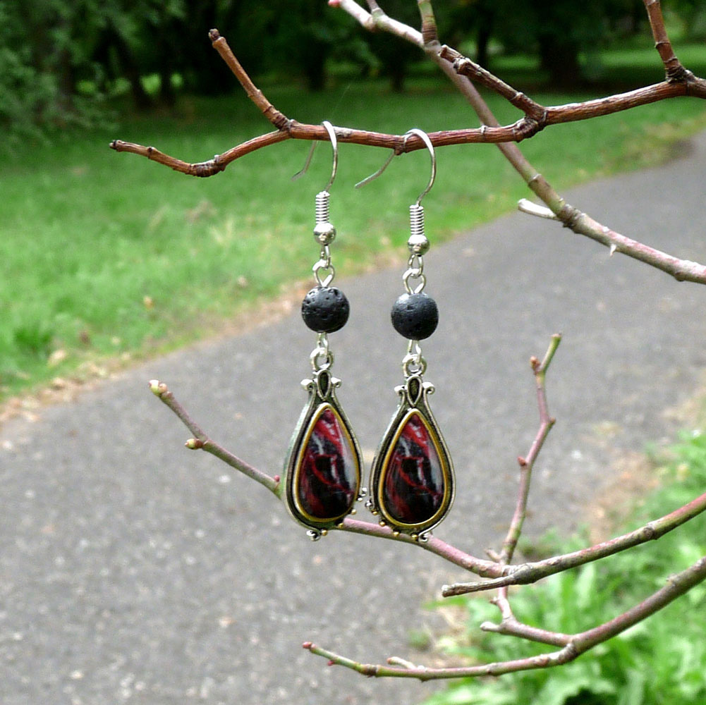 Náušnicím dominuje přívěsek s lůžkem vyplněným černočerveným motivem, zalitým křišťálovou pryskyřicí