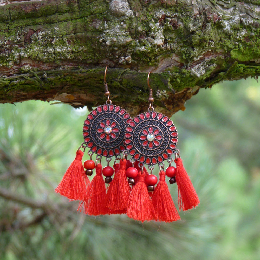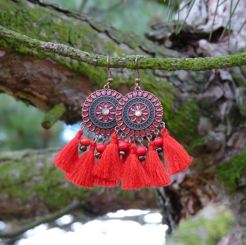 Pod přívěskem jsou zavěšeny červené střapečky z bavlněných nití
