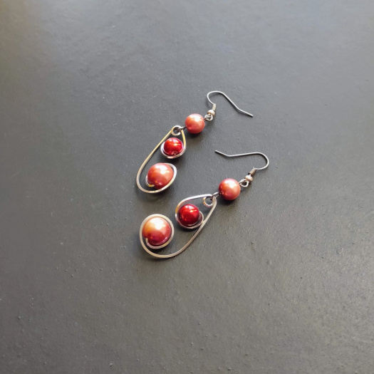 Náušnice z nerezového profilovaného stříbrného 0,8 mm hrubého drátu a oranžových voskovaných korálků. Velikost největšího korálku je 0,8 cm.