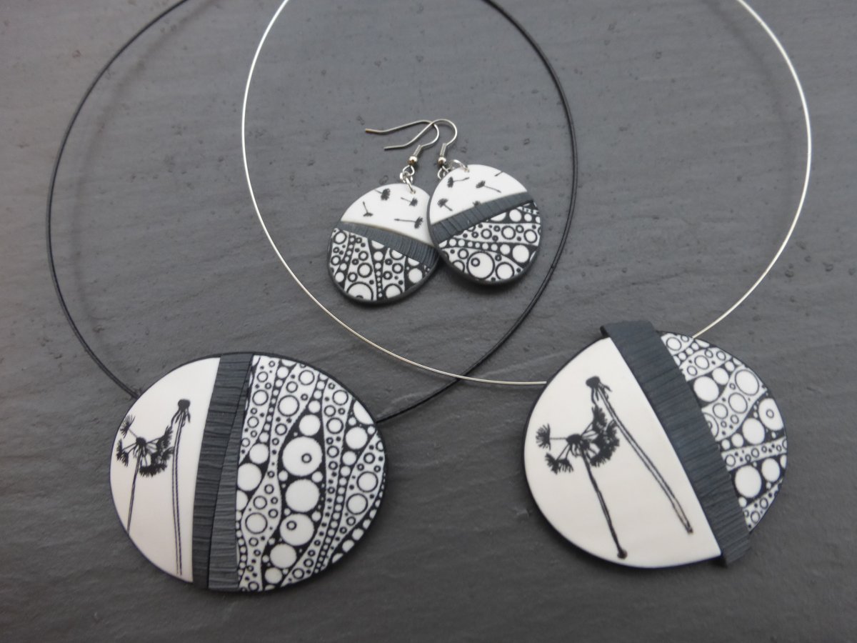 Náušnice z polymerové hmoty Fimo bílé, černé a šedé barvy s motivem pampeliščího chmýří a bublin. Zadní strana šedá, jemně texturovaná, viz doplňkové foto. Rozměr v nejširších místech cca 3,5 x 3 cm, délka vč. afroháčku cca 5,5 cm. Kovové komponenty v barvě platiny.