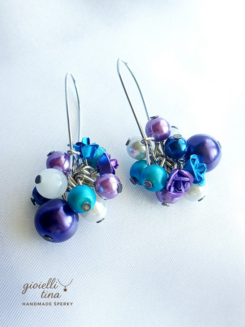 Náušnice jsou inspirované jarními květinami. Jsou tvořené shlukem voskových perel v různých odstínech modré, fialové a bílé. Kromě perleťových a lesklých korálků jsou zdobené kovovými růžičkami.