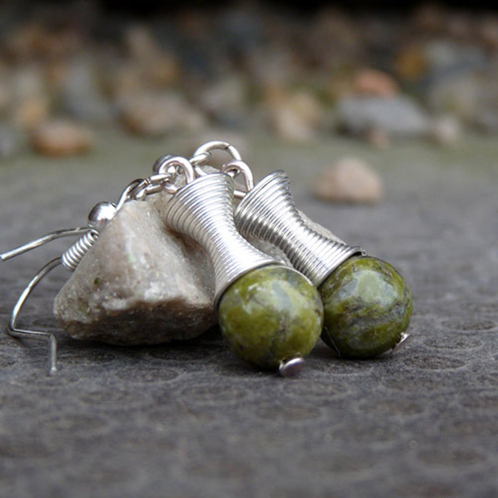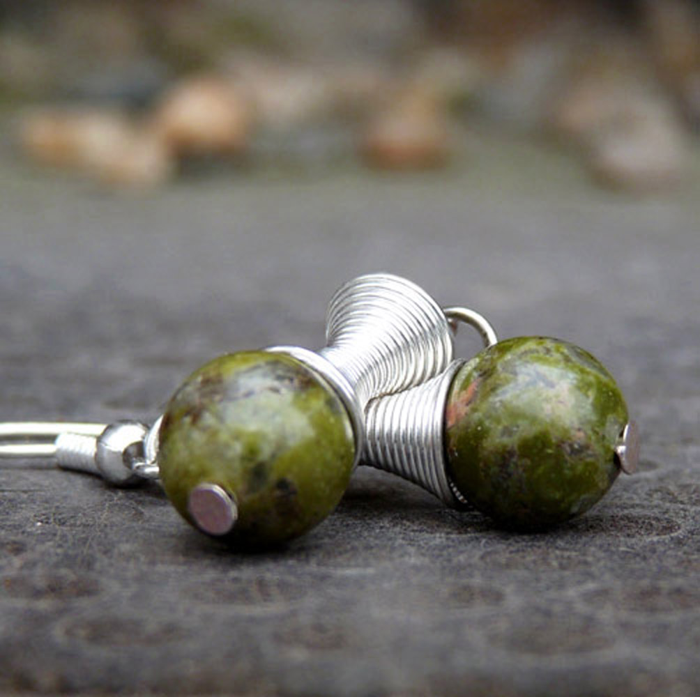 Náušnice tvoří výběrové kuličky unakitu, které jsou zavěšeny pod spirálovitým ozdobným kaplíkem uzavřeným zeleným broušeným korálkem
