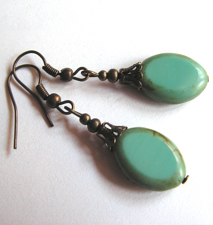 Náušnice vyrobené ze skleněných ploškovaných korálků a komponentů z bižuterního kovu v úpravě staromosaz. Délka náušnic bez háčku je 2,8 cm.