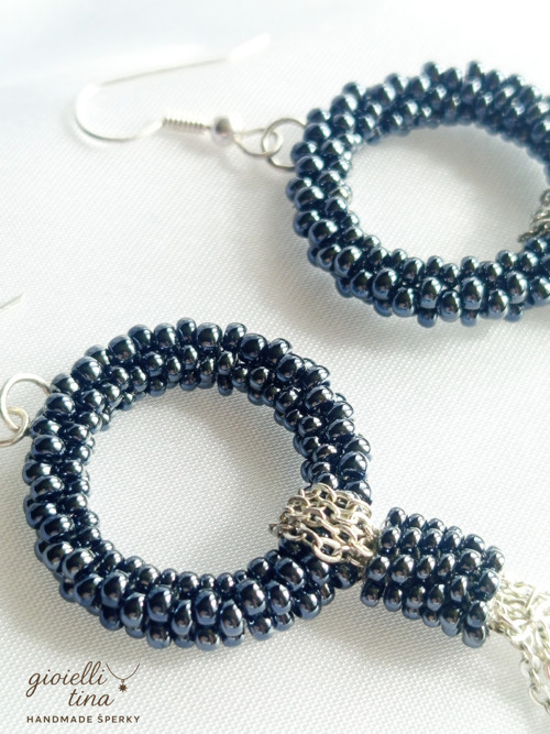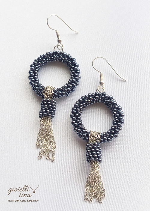 Náušnice jsou ručně vyrobené z antracitových rokajlů, které tvoří elegantní kruhový tvar, a pod nimi se třpytí stříbrné řetízky. Kruh z korálků připomíná noční oblohu, zatímco řetízky dodávají náušnicím pohyb a lesk.