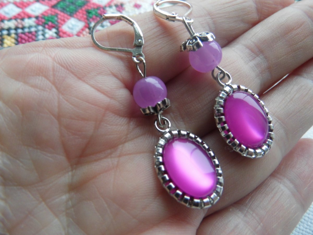 náušnice - ozdobné lůžko oválné,stříbrné barvy,purpurový kabošon,korálek,tibetský kaplík,uzaviratelné zapínání.