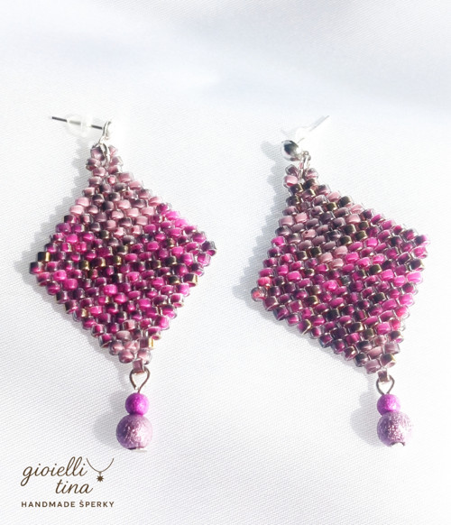 Tyto originální a elegantní náušnice jsou ručně šité z drobných korálků ve tvaru lesklého kosočtverce. Korálky v odstínech purpurové, růžové a hnědé jsou pečlivě uspořádány tak, že vytvářejí zajímavý pixelový efekt. Ve spodní části každé náušnice je zavěšený malý purpurový korálek s jemným třpytem, který dodává celku dynamiku. Náušnice se zapínají na puzetu a jsou ideálním doplňkem pro každodenní nošení i speciální příležitosti.