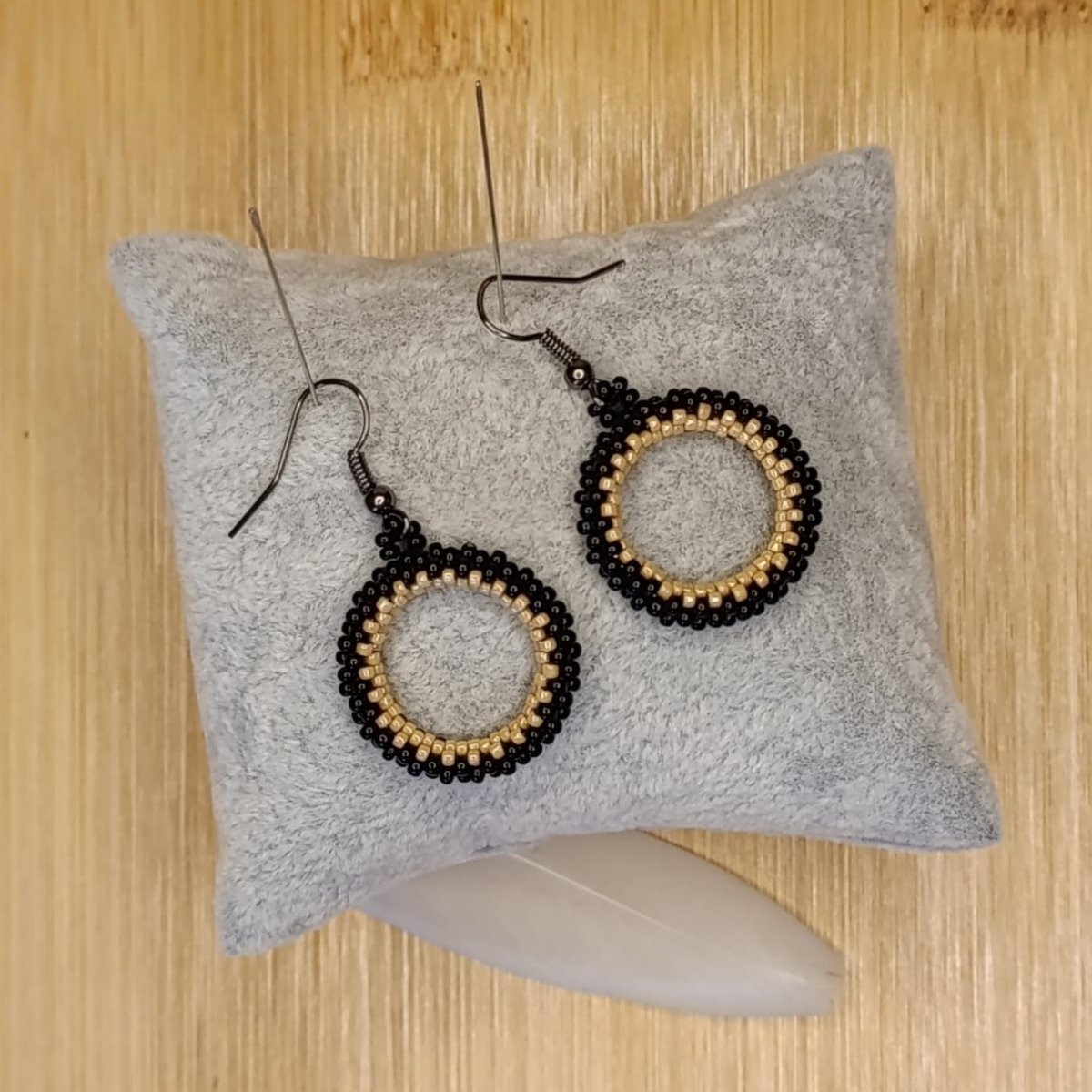 Náušnice šité peyot stylem, rokajlem obšitý kovový kroužek.