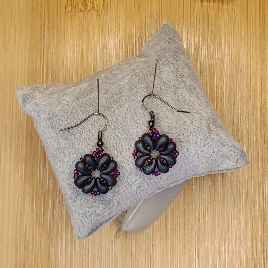 Náušnice šité vzorem "čtyřlístek" NYMO nití, z rokajlu a skleněných korálků Zoliduo barev černé/antracit.