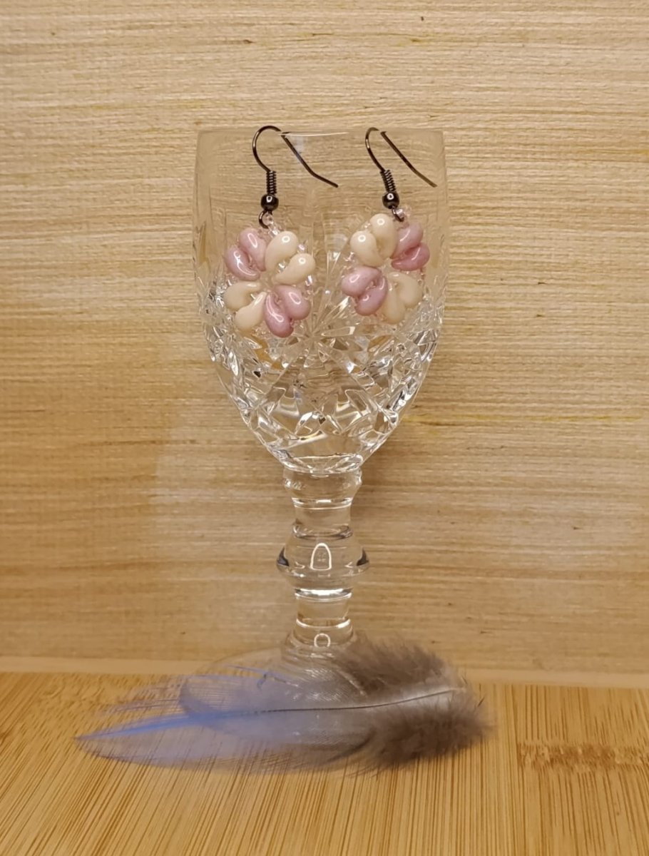 Náušnice šité vzorem "čtyřlístek" NYMO nití, z rokajlu a skleněných korálků Zoliduo barev růžové a béžové.