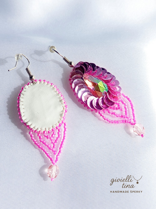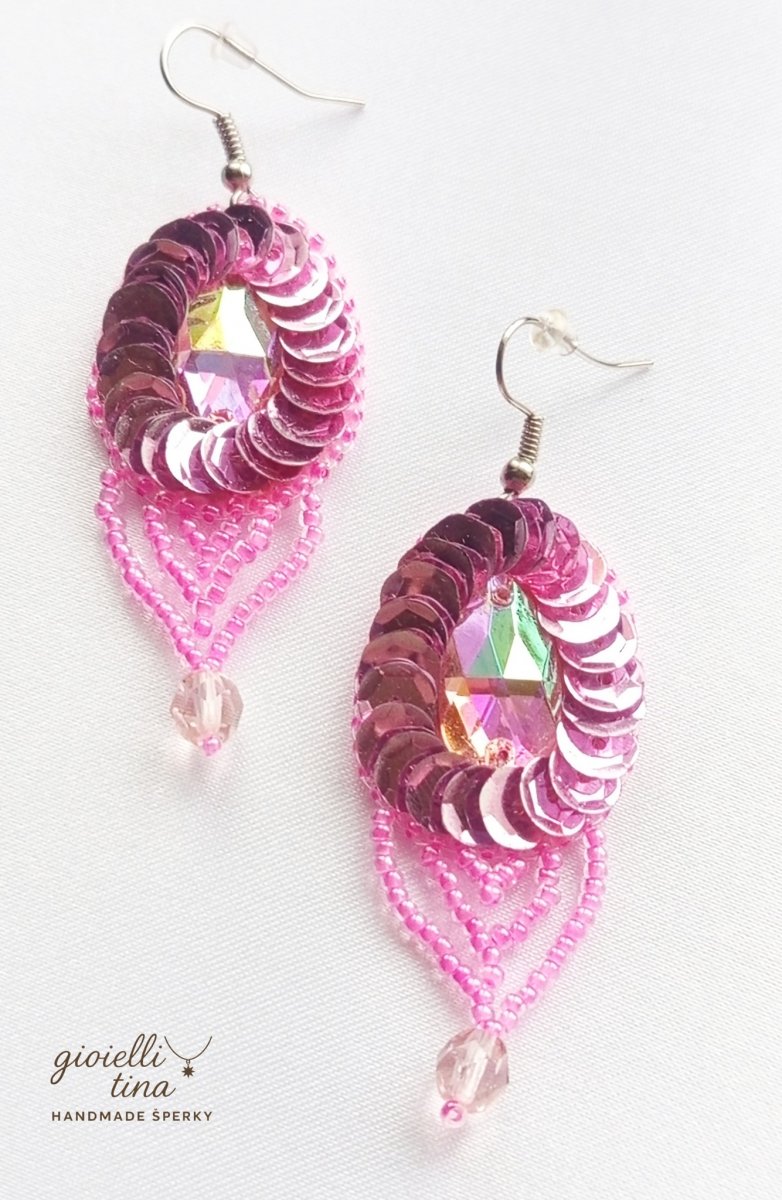 Tyto jedinečné náušnice jsou ručně vyšívané z růžových flitrů, které tvoří elegantní oválný tvar. Uvnitř oválu je umístěný fasetovaný korálek, který se třpytí všemi barvami duhy. Spodní část náušnic zdobí jemné řady drobných korálků, připomínající kapky vody.