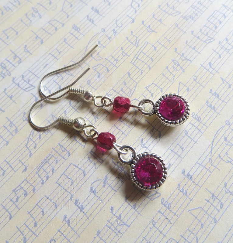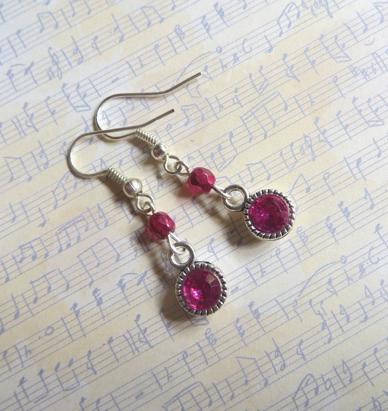 Náušnice vyrobené z komponentů se skleněnými šatonky, broušených korálků - ohňovek - a komponentů z bižuterního kovu. Délka náušnic bez háčku je 2,1 cm.