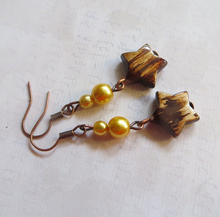 Náušnice vyrobené z akrylových hvězdiček, skleněných voskovaných perlí a komponentů z bižuterního kovu v úpravě staroměď. Délka náušnic bez háčku je 3 cm.