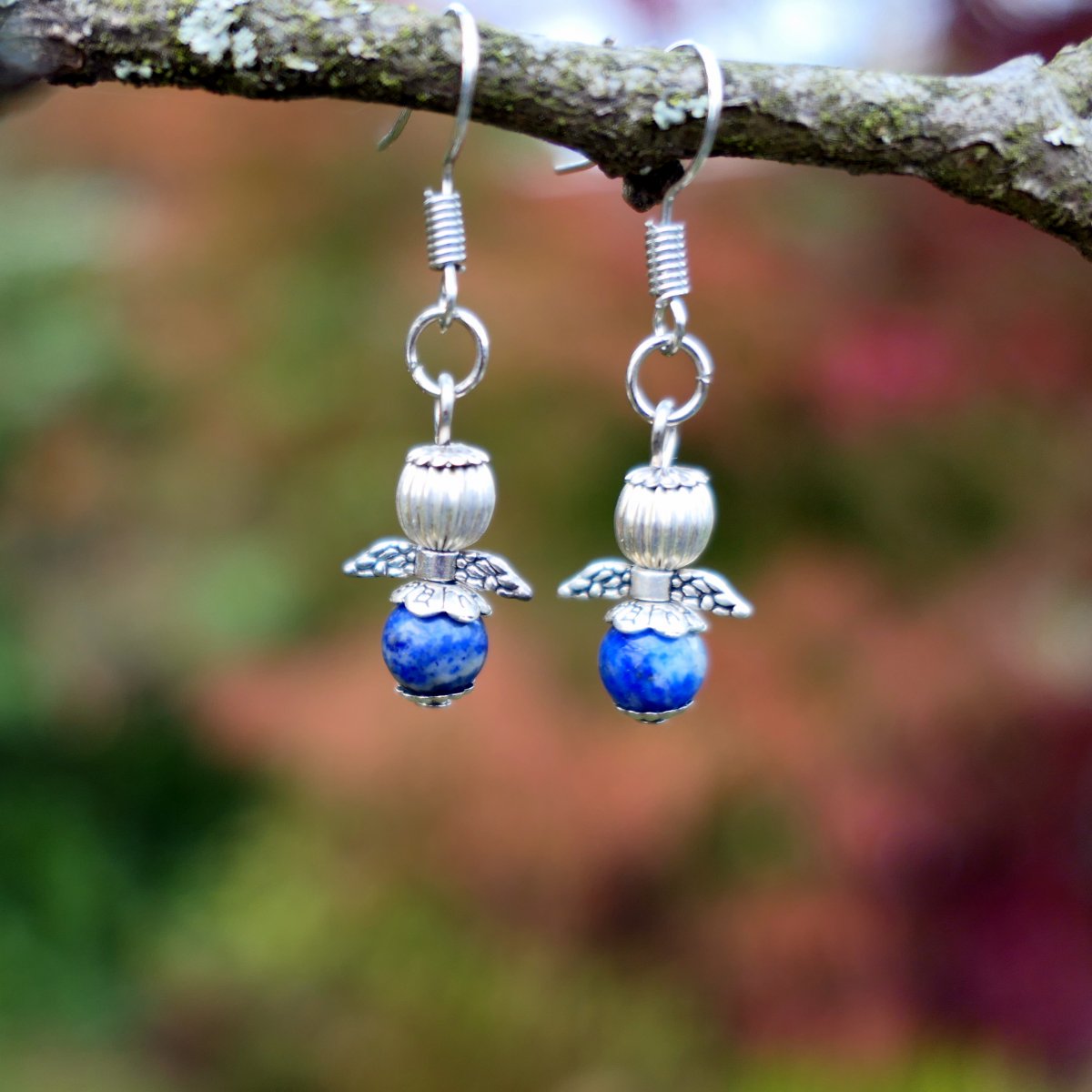 Použity kuličky sodalitu, kuličky kovových korálků, drobné kovové kaplíky a křidélka.