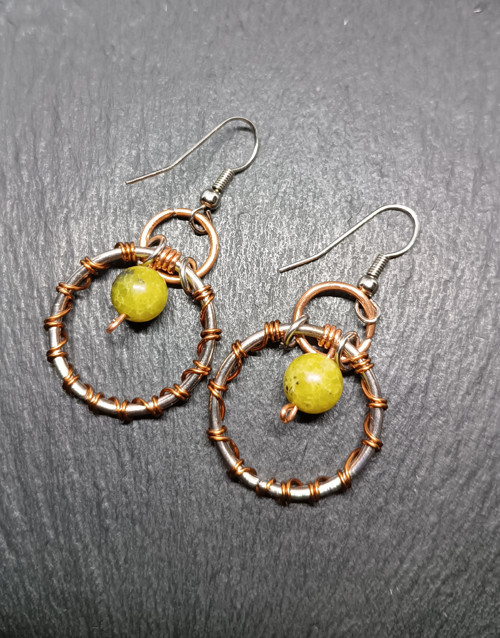 Kruhové náušnice jsou vyrobeny z nerezové oceli, zdobeny mědí a korálky serpentinu.