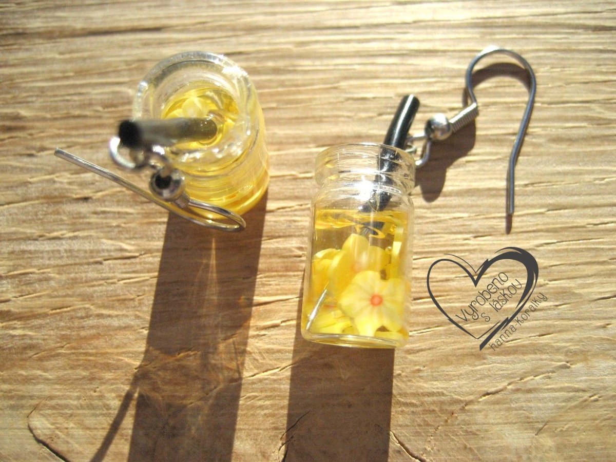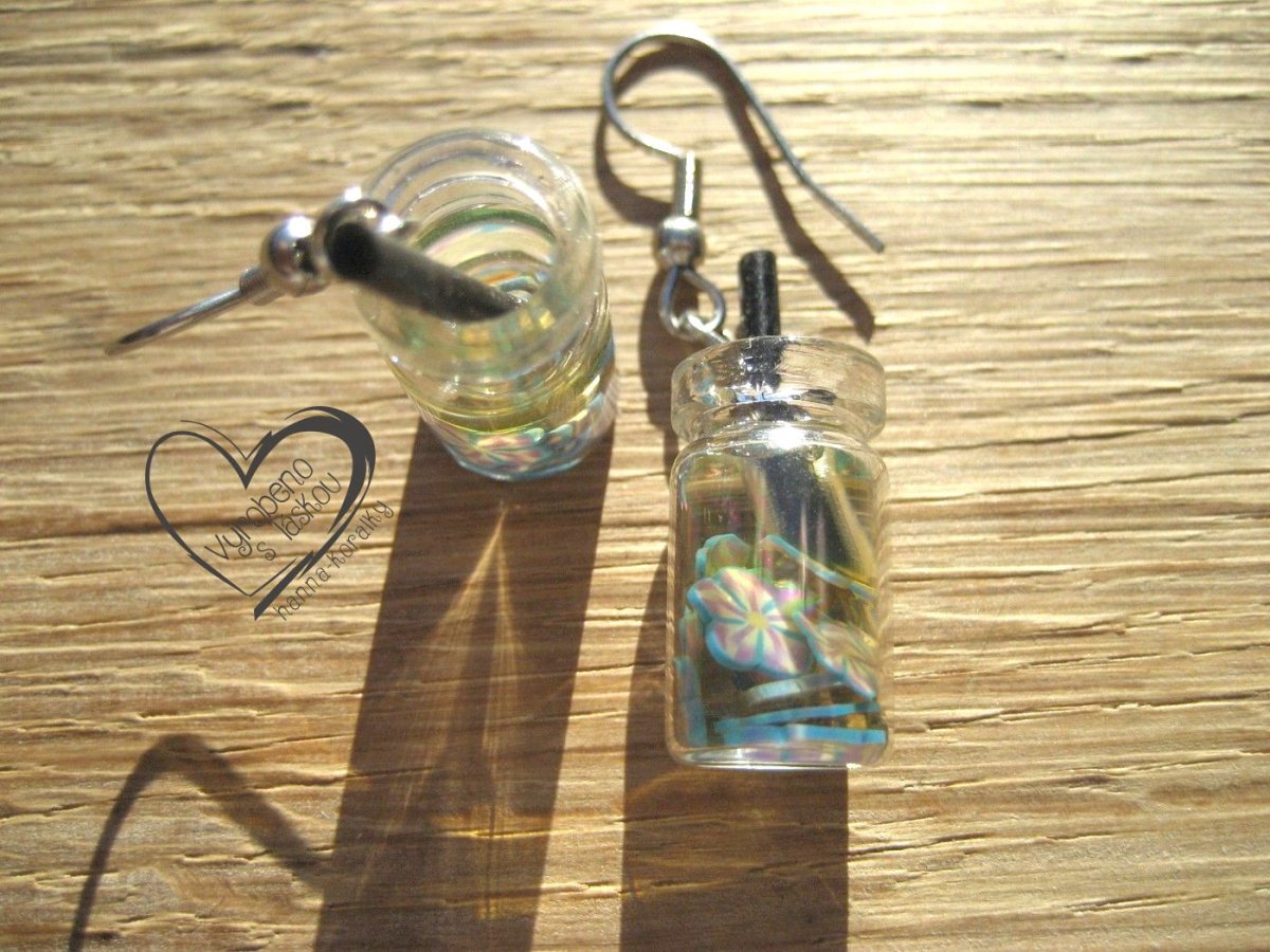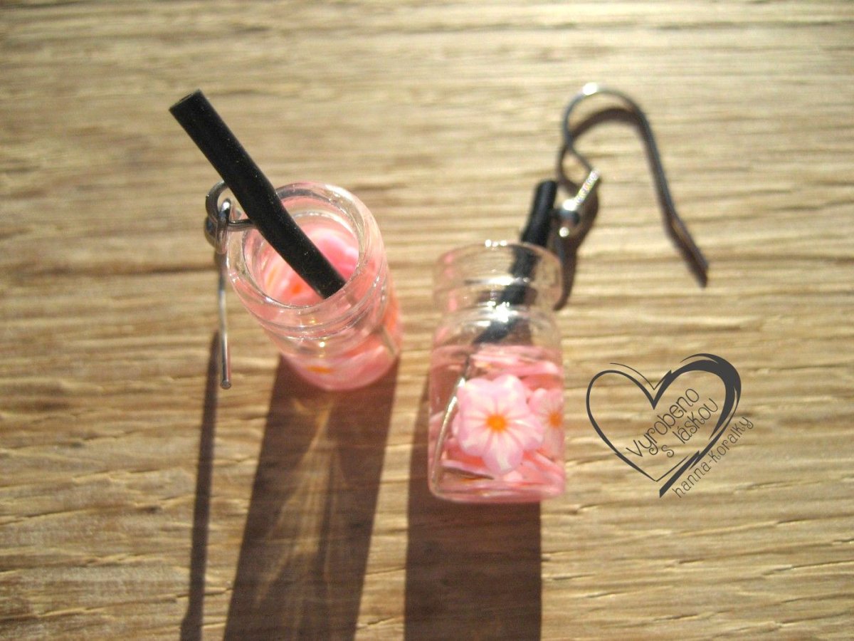 Veselé, hravé letní náušnice - skleněná sklenička s letní limčou, brčkem a květy v 5 barvách - žlutá, růžová, modrá, světle žlutá, světle růžová - délka náušnic 4,1cm včetně náuš. háčku z nerez oceli, uvedená cena je za jeden pár náušnic, do poznámky uveďte vybranou barvu