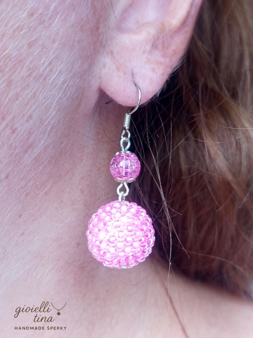 Tyto nápadné a veselé náušnice ve stříbrném provedení jsou ideálním doplňkem pro každou ženu, která miluje barvy. Jsou tvořeny dvěma korálky, kde spodní korálek je tvořený drobnými růžovými rokajlovými korálky, které jsou pečlivě uspořádané do tvaru kuličky, což vytváří krásný, strukturovaný povrch a horní korálek je průhledný, světle růžový a má jemnou, prasklinovou texturu, která mu dodává zajímavý vzhled.