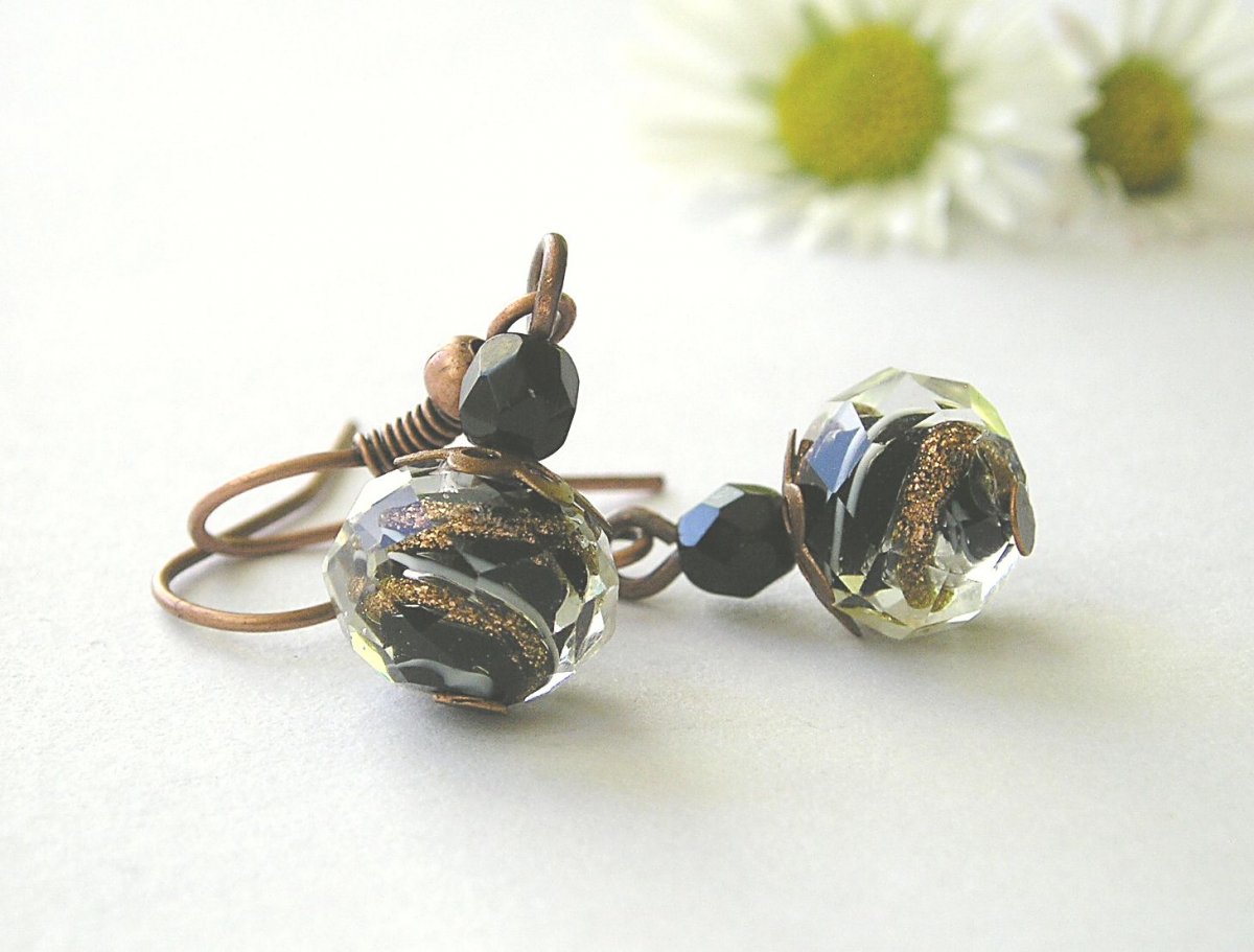 Náušnice jsou vyrobeny ze zajímavých skleněných korálků ve tvaru disku 8x10 mm ( čirý výbrus s černým středem a zdobený měděnou a černou spirálkou ). Dále jsem použila skleněné broušené korálky 4mm a bižuterní komponenty měděné barvy.