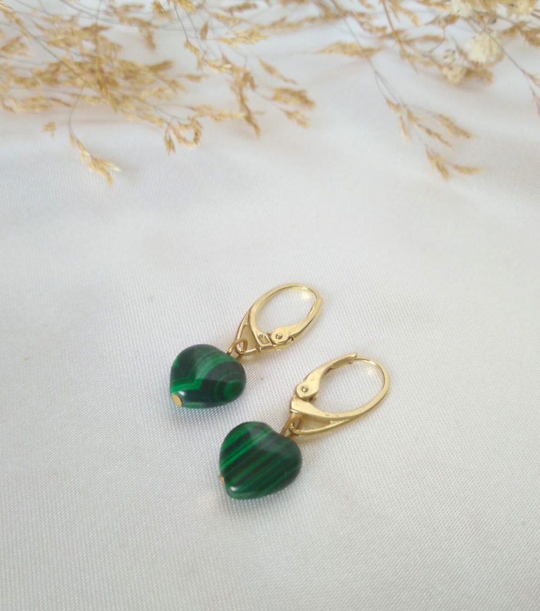 Náušnice v tvare srdiečok sú vyrobené z pravého prírodného polodrahokamu malachit. Srdiečka sú 10 x 10 mm veľké.