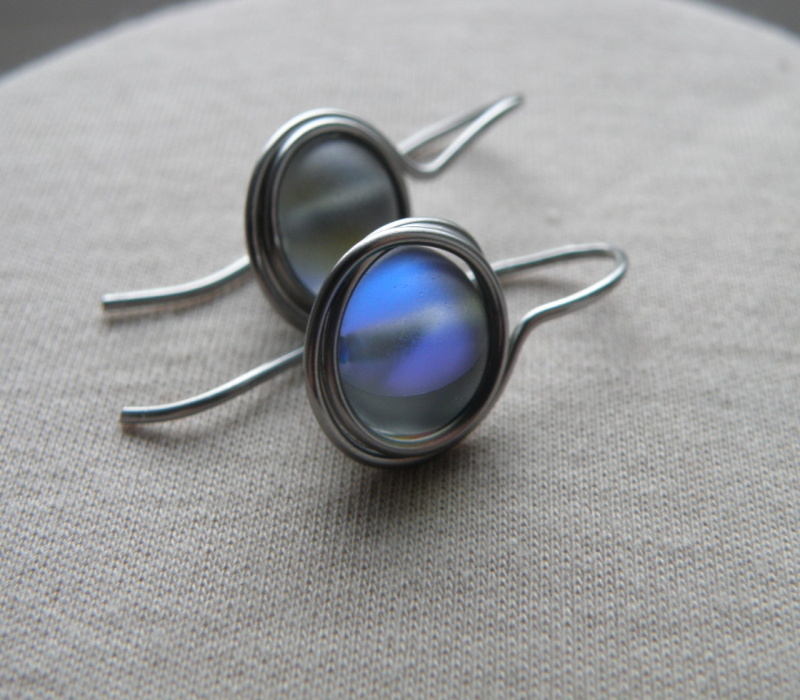 Naušnice samostatné z chirurgické oceli, zdobí je syntetický zirkonit. Nejsou těžké, roztomilé., malé, ale výrazné.... Při otáčení s kuličkou vznikají záblesky.zamotané v nerezovém poudře.