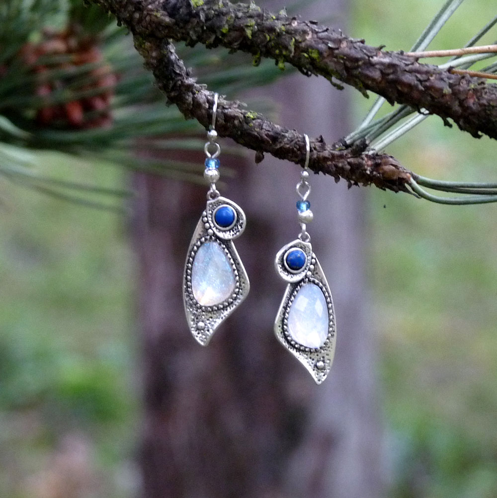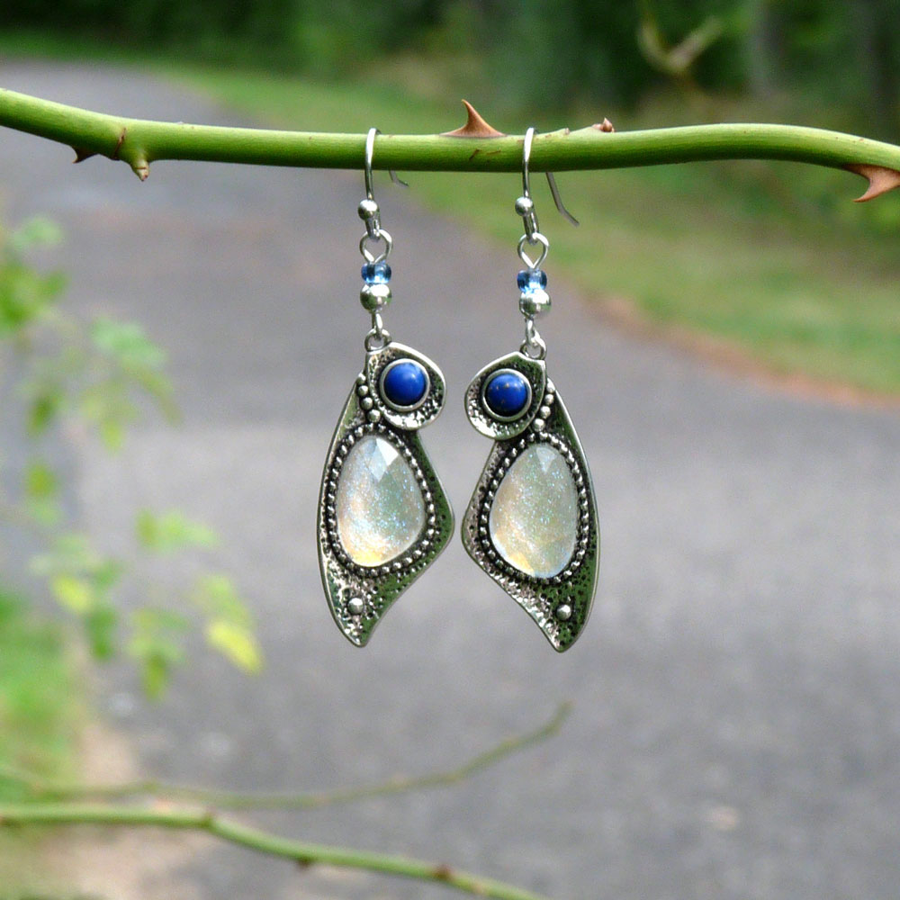 Větší kabošon je v bílé barvě s duhovým třpytem, menší kabošon je modrý.