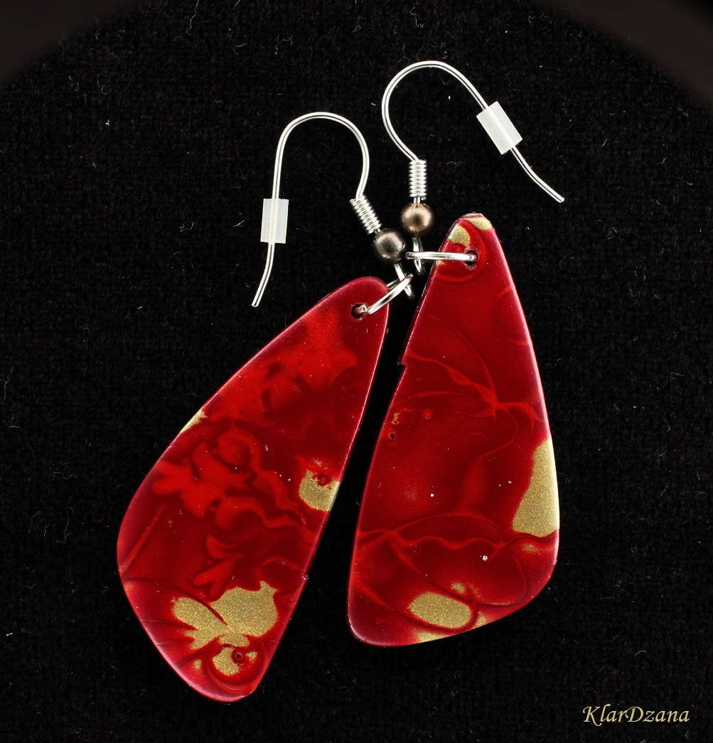 Elegantní drobné náušnice z polymeru ve vínovo-červeno-zlatých barvách ve tvaru motýlích křídel