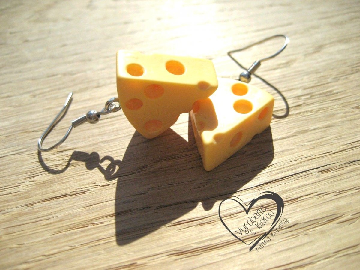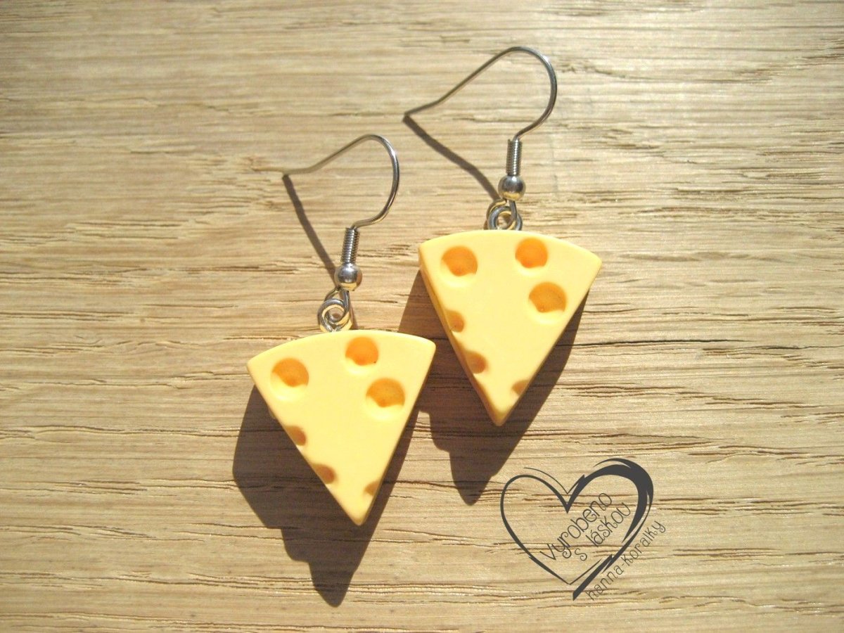 Vtipné a neobvyklé sýrové náušnice z pryskyřice - klínek tvrdého sýru - velikost motivu 2 x 2 cm + náušnicový háček z nerez oceli