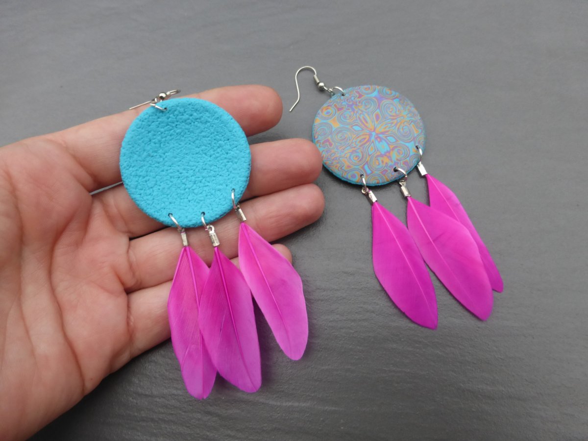 Náušnice z polymerové hmoty Fimo doplněné o barvená peříčka. Přední strana hladká, lehce leštěná, zadní strana tyrkysová, jemně texturovaná viz doplňkové foto. Průměr kruhů cca 4 cm. Délka vč. afroháčku cca 11 cm. Komponenty z obecného kovu v barvě platiny.