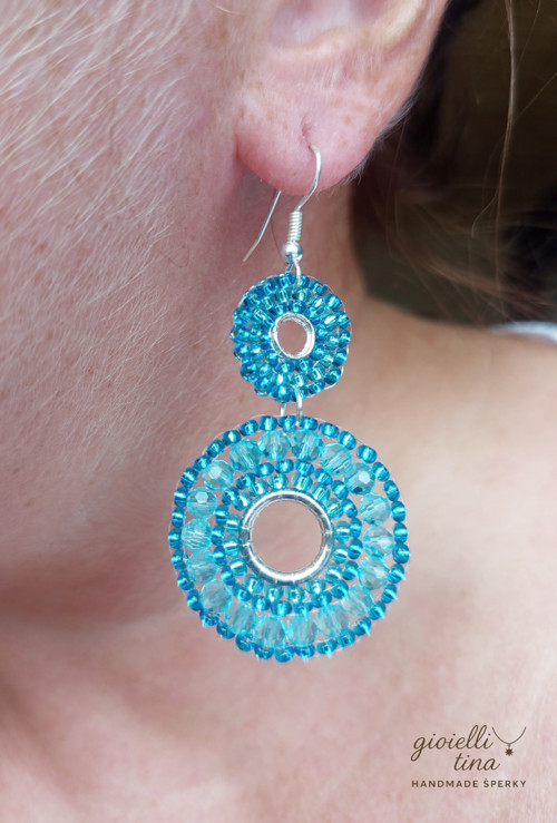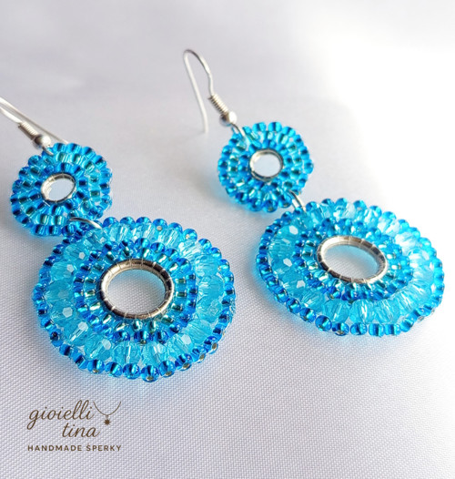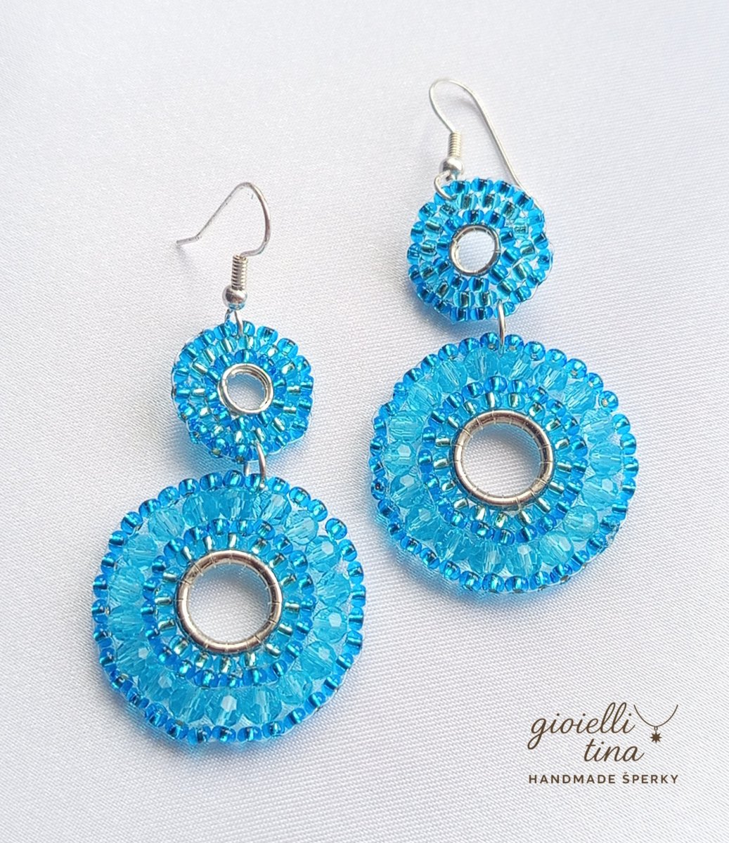 Tyto originální a nepřehlédnutelné náušnice se skládají ze dvou kulatých částí, které připomínají slunce nebo květy. Jsou pečlivě vytvořené technikou korálkové výšivky z drobných fasetovaných korálků v zářivém tyrkysově modrém odstínu. Uprostřed každé části je stříbrný kroužek, který dodává šperku moderní a čistý vzhled. Náušnice jsou zavěšené na stříbrném háčku. Díky své barvě a designu se hodí na letní dny i na oživení každodenního outfitu.