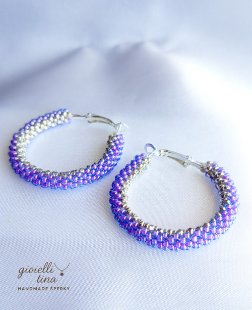 Tyto kruhové náušnice jsou ručně vyšívané z drobných korálků (rokajlů) ve dvou odstínech, které se elegantně střídají a tvoří spirálovitý vzor. Kombinace perleťově stříbrných a duhově fialových korálků připomíná galaktické mlhoviny a dodává náušnicím mystický a moderní vzhled.