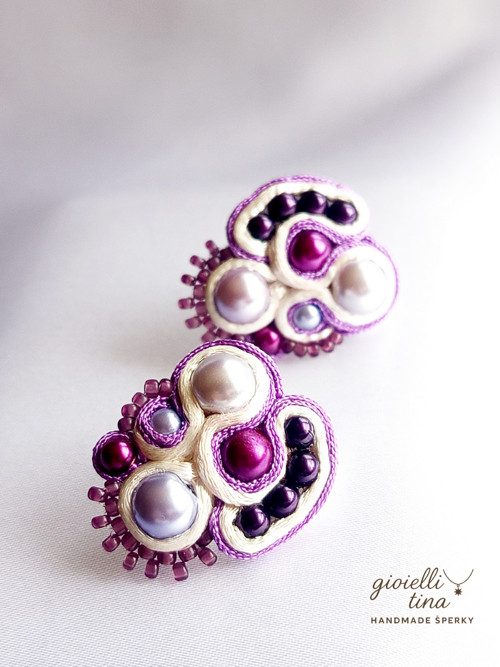 Tyto originální náušnice jsou inspirované krásou vinic a hroznů. Jsou vytvořené technikou soutache, kde jsou korálky a perly ve fialových a krémových odstínech pečlivě obšité saténovými šňůrkami.
