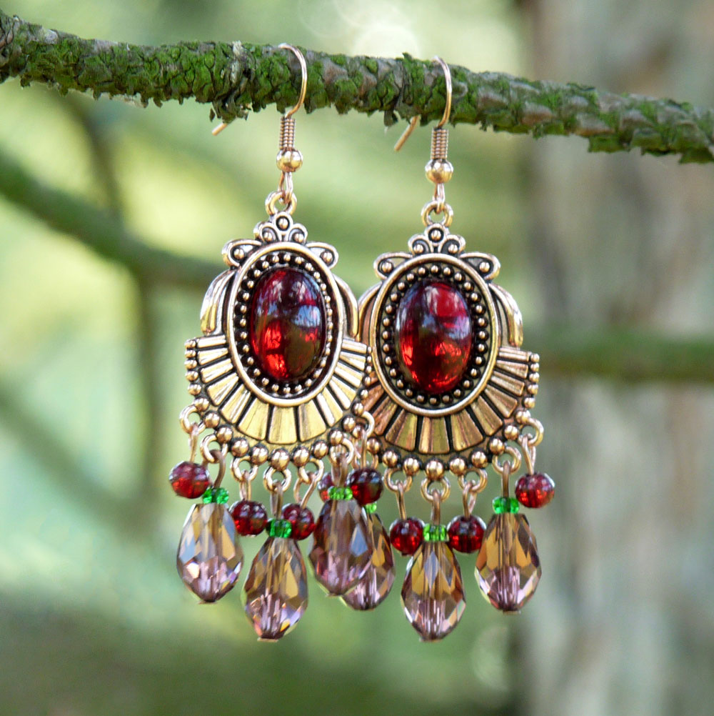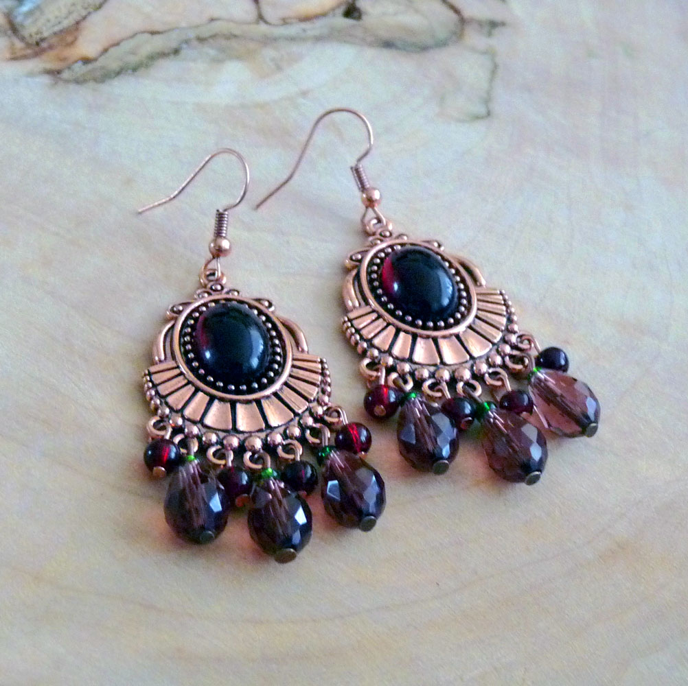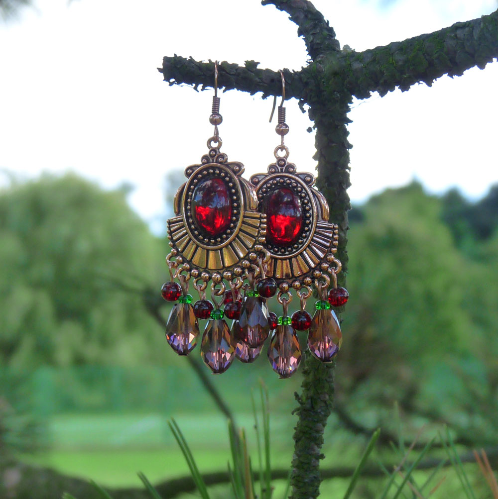 Visací náušnice tvořené zdobeným přívěskem s vlepeným kabošonem z z křišťálové pryskyřice barvené do vínova