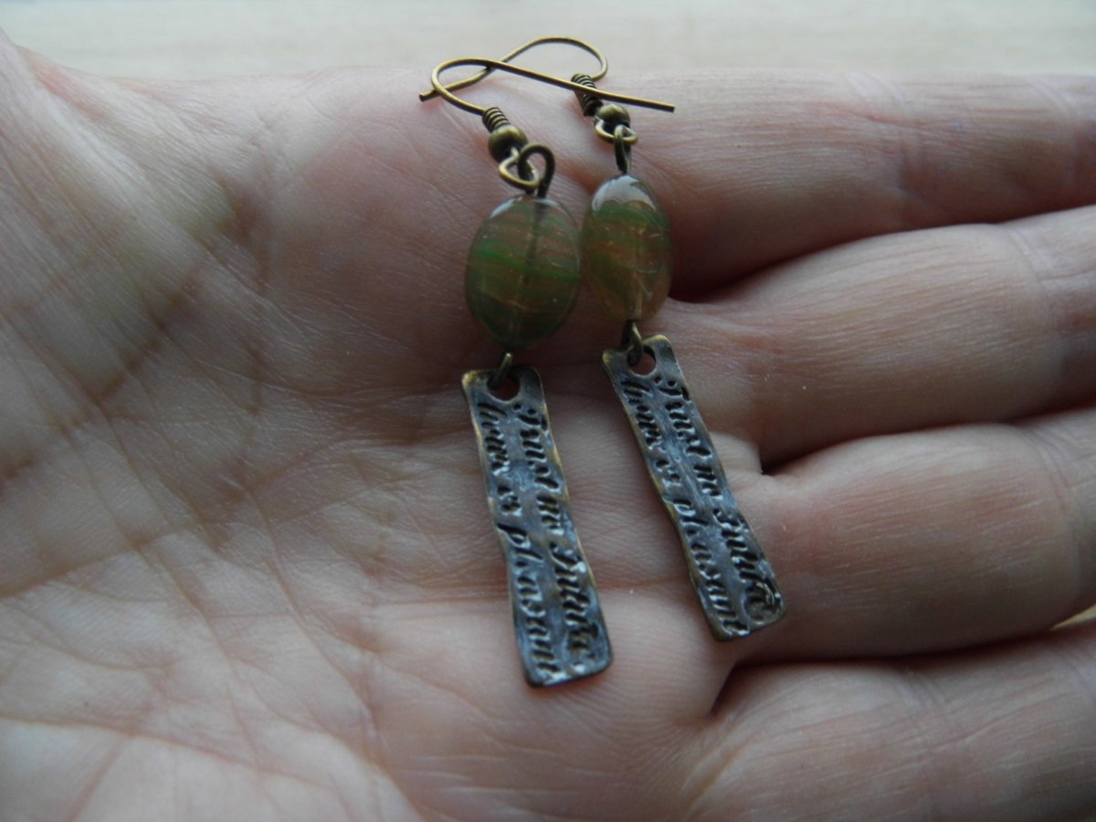 náušnice visací,kovový komponent s nápisy 23x5mm patina stará bílá