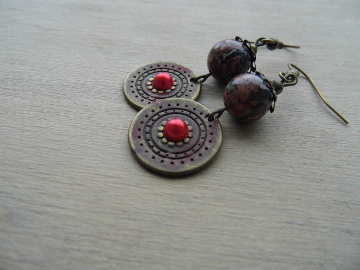 náušnice vintage - kovový kruhový komponet bronzové barvy - jemná červená patina