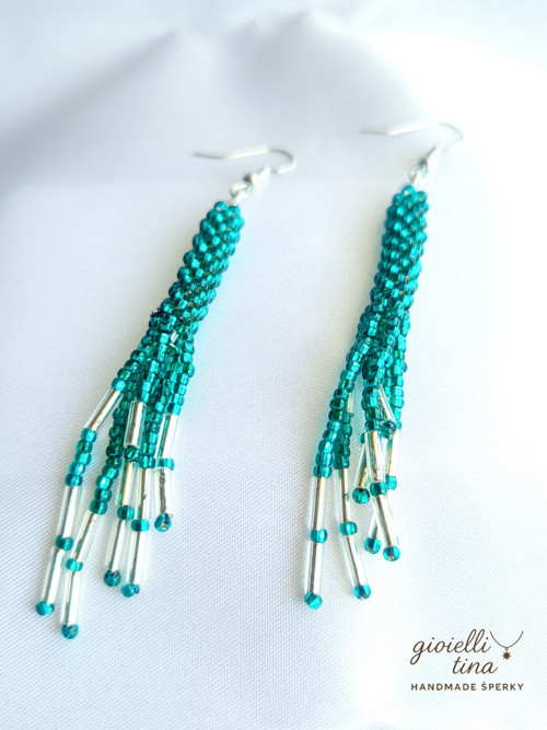 Náušnice jsou ručně vyrobené z drobných rokajlů v sytě zeleno modré barvě, které tvoří třásně. Korálky se postupně prolínají s lesklými stříbrnými válečky, připomínajícími kapky vody.