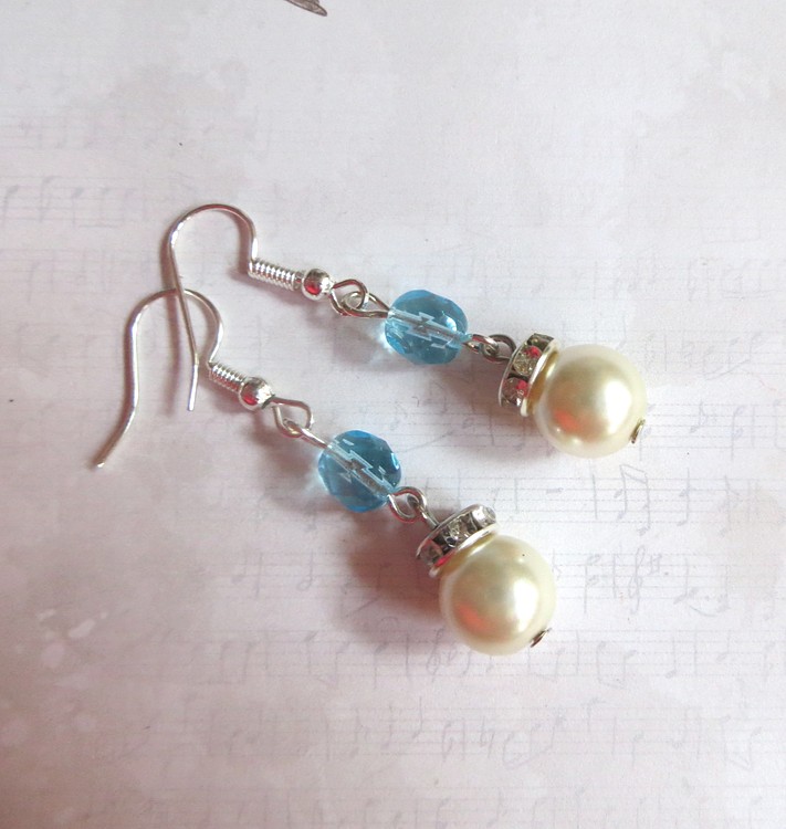Romantické náušnice vyrobené ze skleněných voskovaných perlí, broušených korálků - ohňovek - a rondelek se štrasovými kamínky. Ostatní komponenty jsou z bižuterního kovu. Délka náušnic bez háčku je 3 cm.