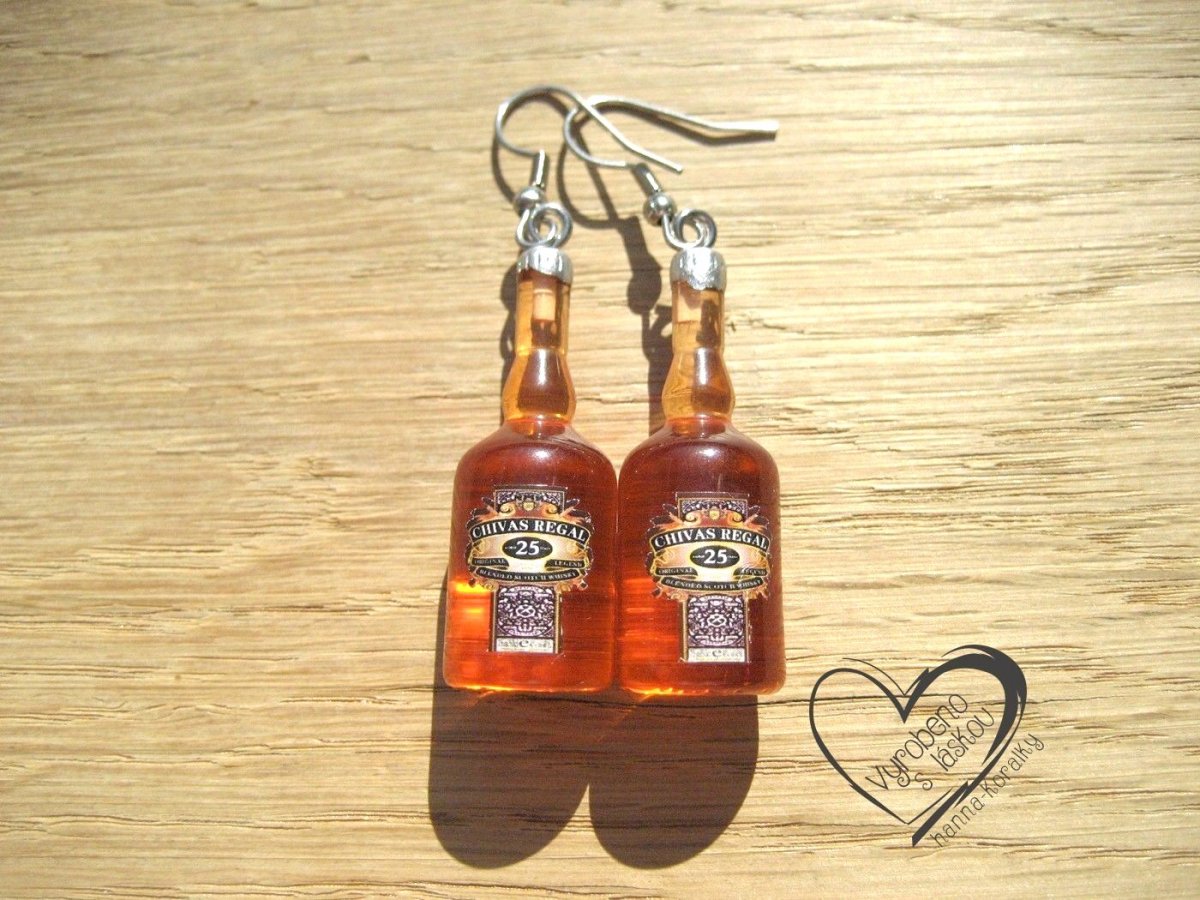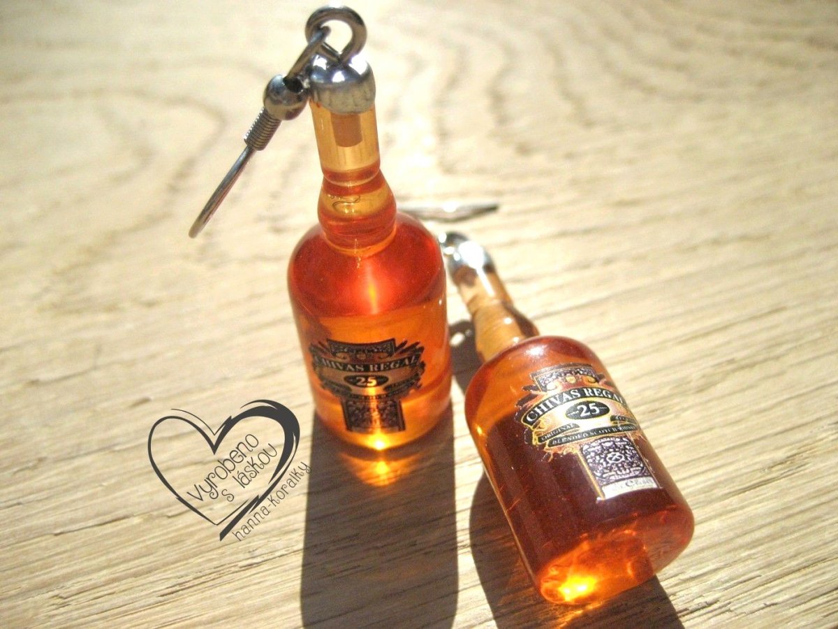 Vtipné náušnice z pryskyřice - mini láhev whisky - výška motivu 3,5 cm + naušnicový háček z nerez oceli, uvedená cena za 1 pár náušnic
