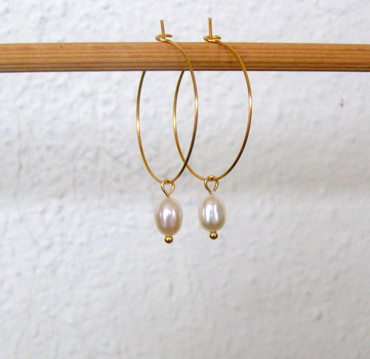 Kruhové náušnice - kreolky ze zlaté chirurgické oceli, pozlacené metodou PVD a smetanových říčních perel AAA kvalita.