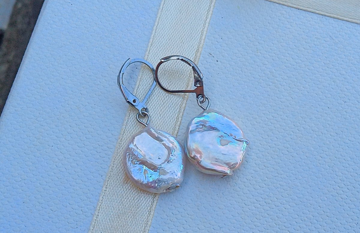 Tyto elegantní visací náušnice se vyznačují výraznými, nepravidelně tvarovanými jihomořskými perlami, které mají rozměry přibližně 15 mm v průměru. Perly vynikají vysokým perleťovým leskem s nádhernými duhovými odlesky na povrchu.