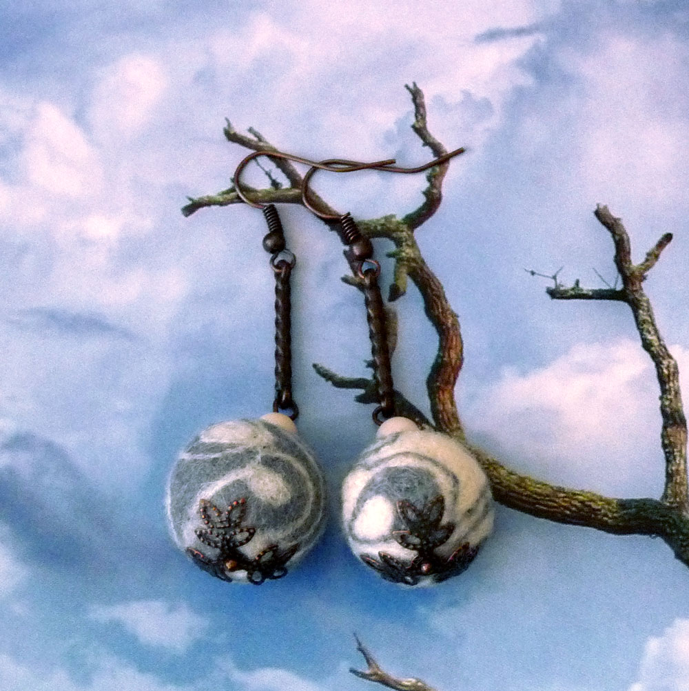 Náušnice tvoří dvě kuličky pevně plstěné, jedna je šedá s bílou kresbou a druhá bílá s šedou kresbou (ta je o 2 mm menší)