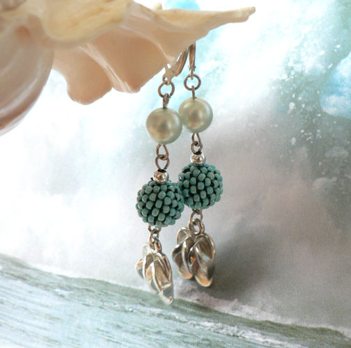 Dlouhé náušnice tvořené pečlivě obšívanou kuličkou drobounkým rokajlem modré barvy s duhovým efektem, stříbrnou kuličkou a perličkou.