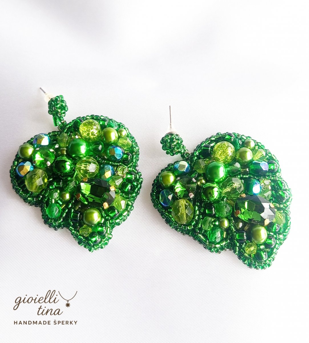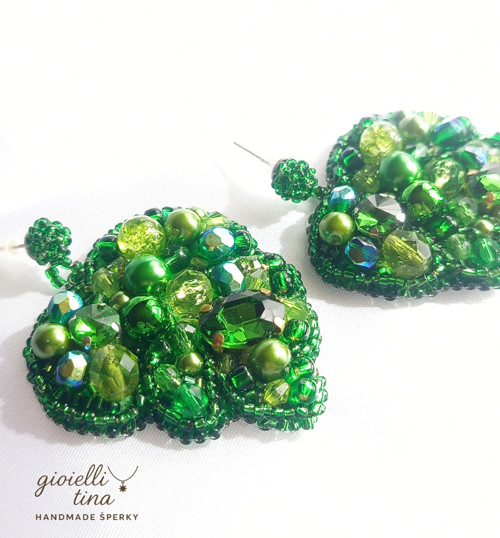 Tyto ručně šité náušnice ve tvaru lístku jsou bohatě zdobené korálky v různých odstínech zelené barvy. Kombinují se zde lesklé perličky, fasetované korálky i drobné rokajlové korálky, které spolu vytvářejí krásnou texturu a odlesky. Zářivě zelená barva symbolizuje přírodu, růst a harmonii. Náušnice se zapínají na puzetu a jsou ideální pro ty, kteří hledají výrazný a originální šperk, který přitáhne pozornost.