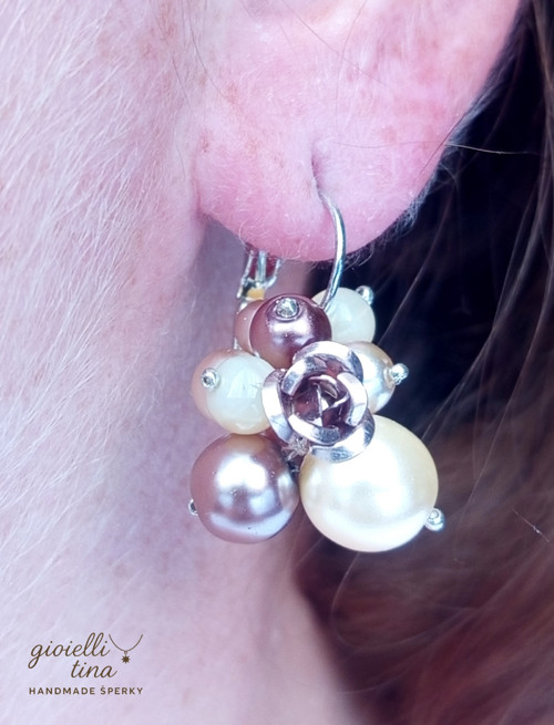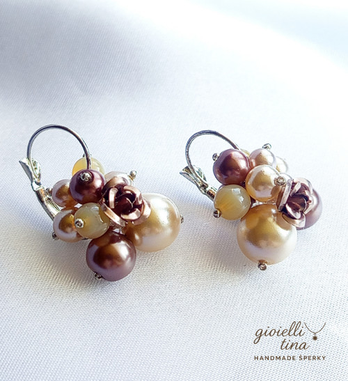 Tyto jedinečné náušnice jsou inspirované krásou podzimní přírody. Jsou tvořené shlukem perleťových a lesklých perel v odstínech hnědé, zlaté, krémové a bronzové. Každou náušnici zdobí kovová růžička v hnědé barvě.