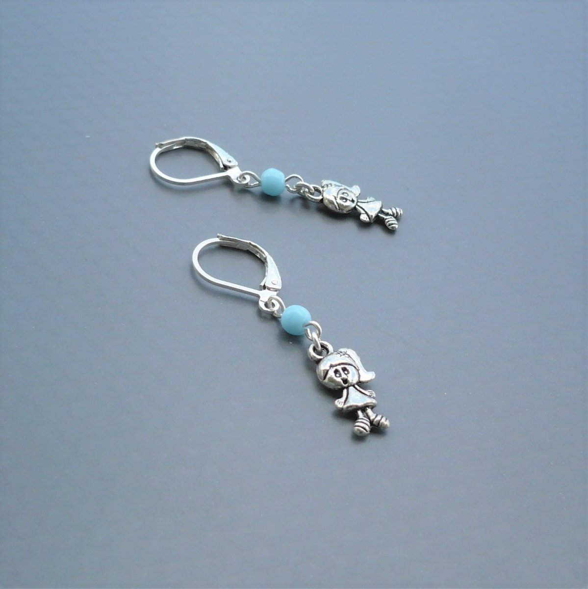 Lehoučké nejen dětské náušnice ze světle modrého skleněnéno korálku a ozdobného bižuterního komponentu v podobě holčičky.