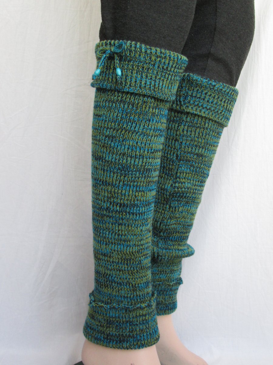 Návleky jsou upleteny pružným vzorem, nahoře je šňůrka na stažení a zároveň návleky zdobí. Na konci šňůrky jsou lakované dřevěné korálky.