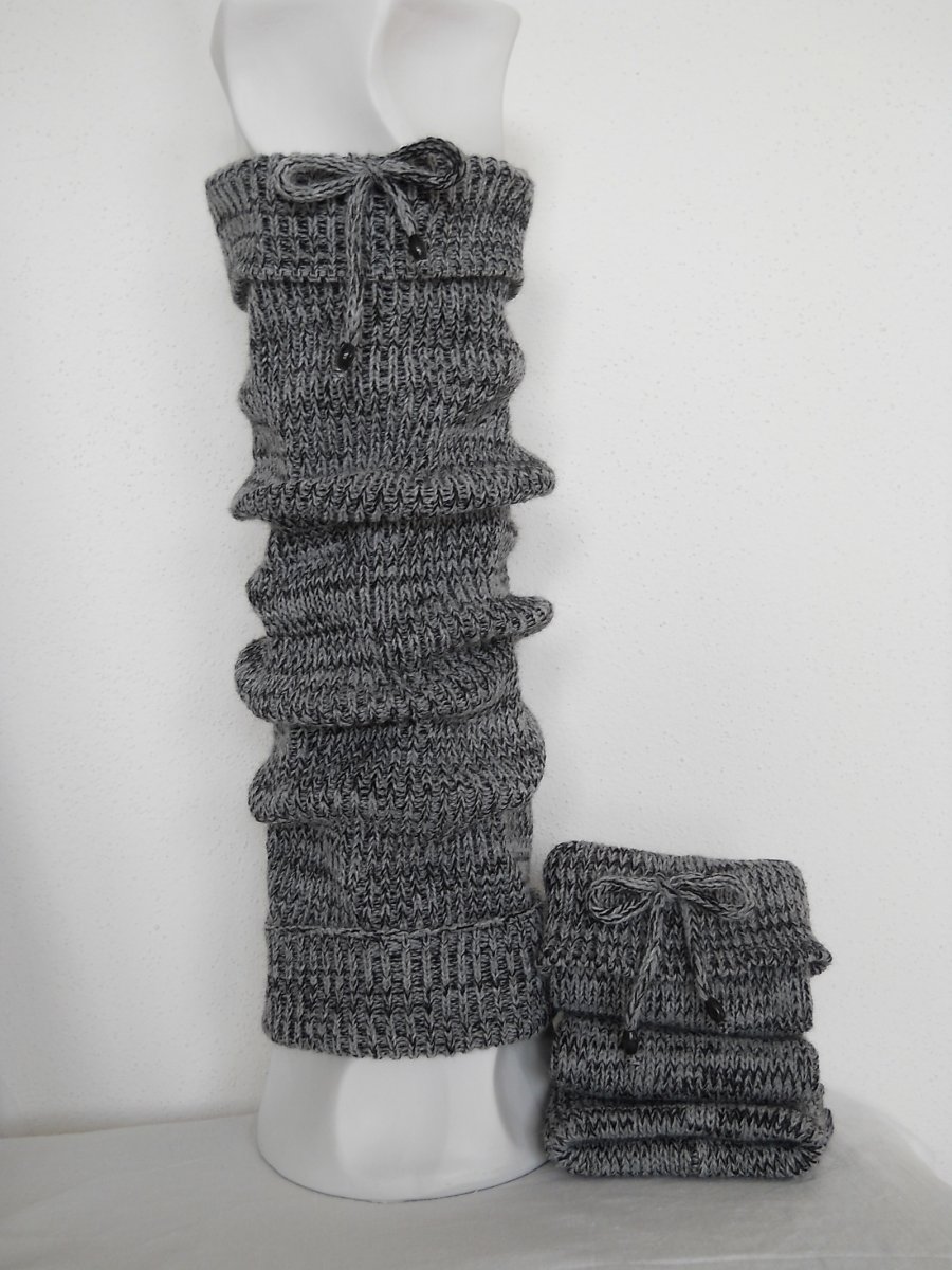 Návleky jsou upleteny pružným vzorem, nahoře je šňůrka na stažení a zároveň návleky zdobí. Na konci šňůrky jsou dřevěné korálky.