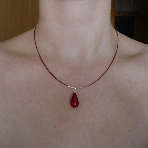 Velká červená voskovaná kapka s ozdobným ďubkatým povrchem je zavěšená na vlastnoručně vyrobené trojité strunce z červeného bižuterního lanka. Obvod náhrdelníku je 47,5 cm - na přání mohu prodloužit/zkrátit, délka přívěsku je 2,3 cm. Zapínání je na karabinku a protikroužek. Použité kovové komponenty jsou z obecného kovu a stříbrné barvy.
