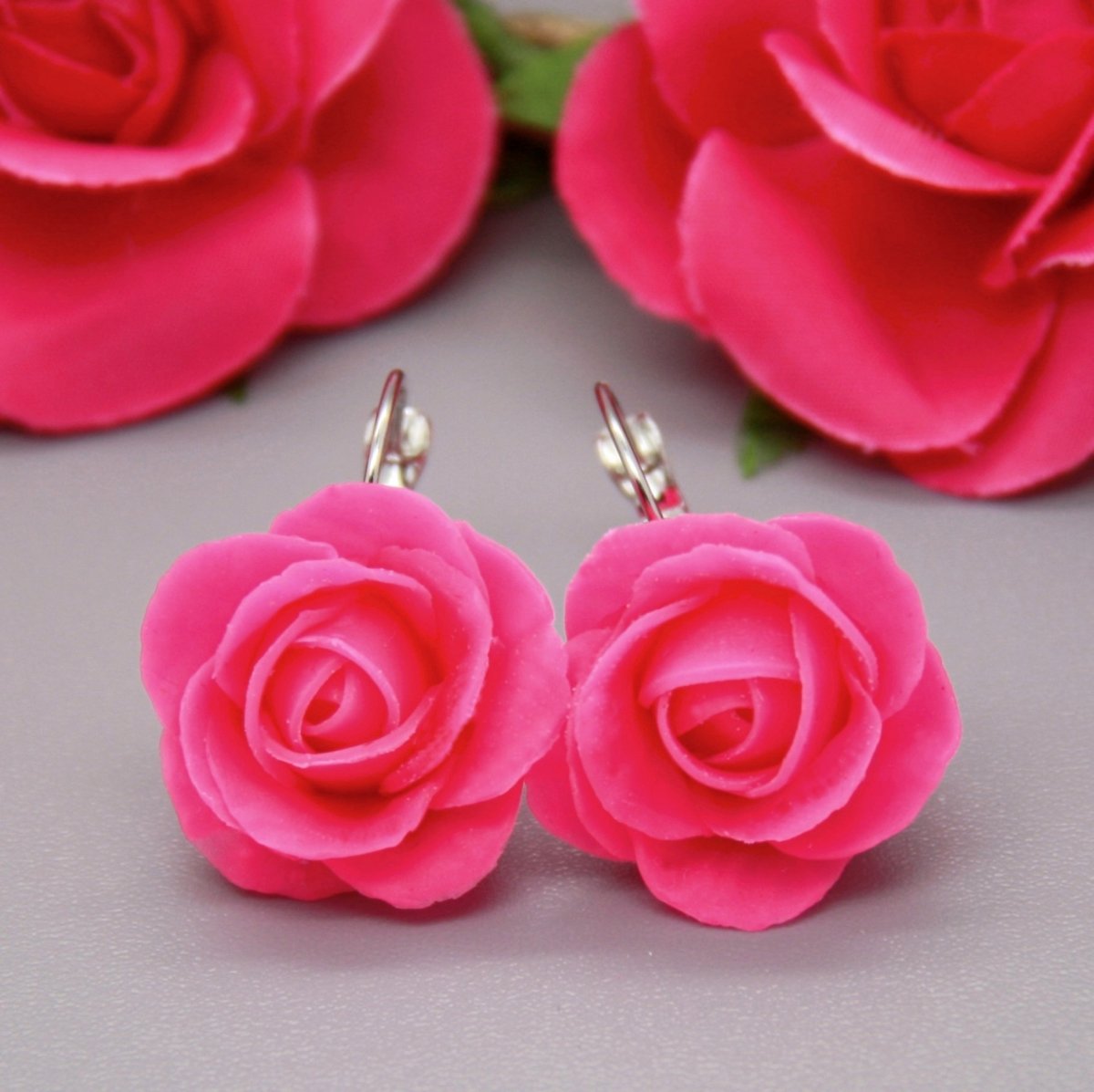 ručně modelovaný šperk z polymerové hmoty, barva růžová neonová, v detailu nafoceno pro představu velikosti a barvy,