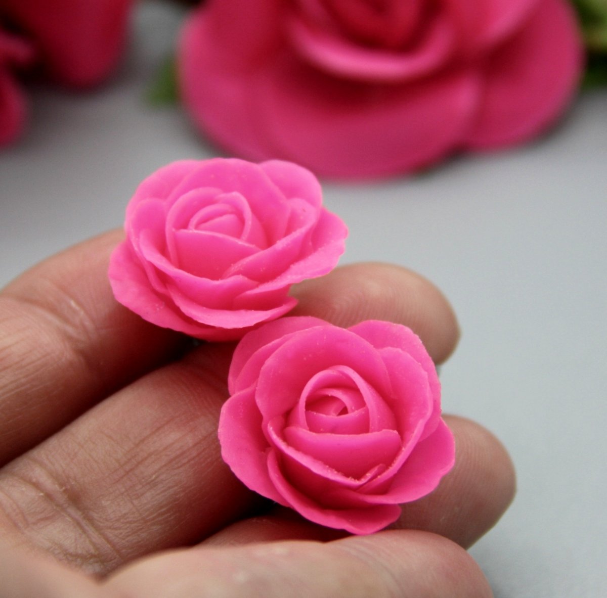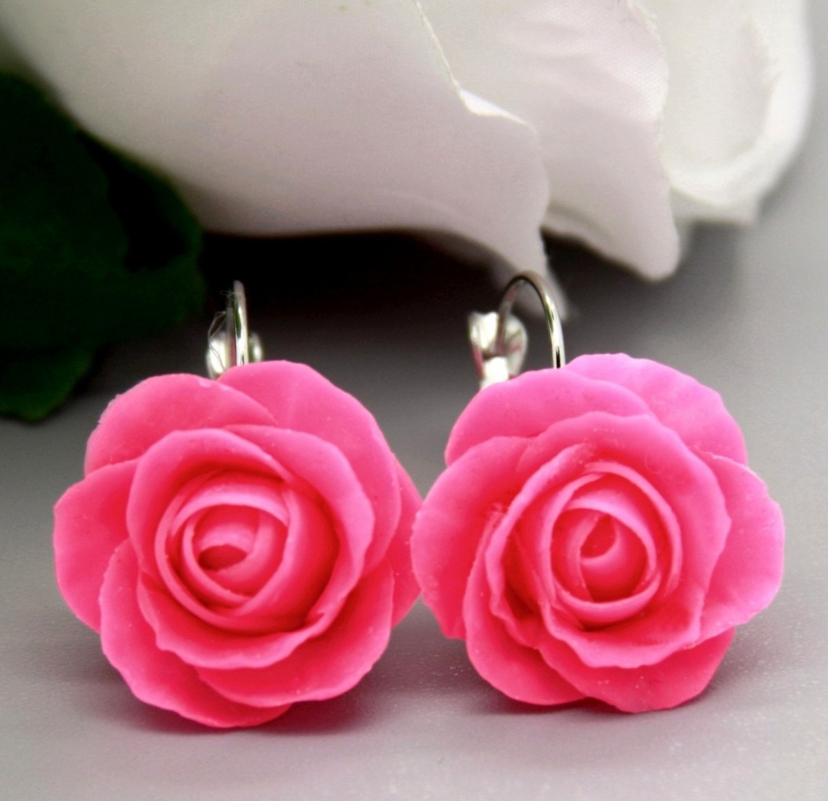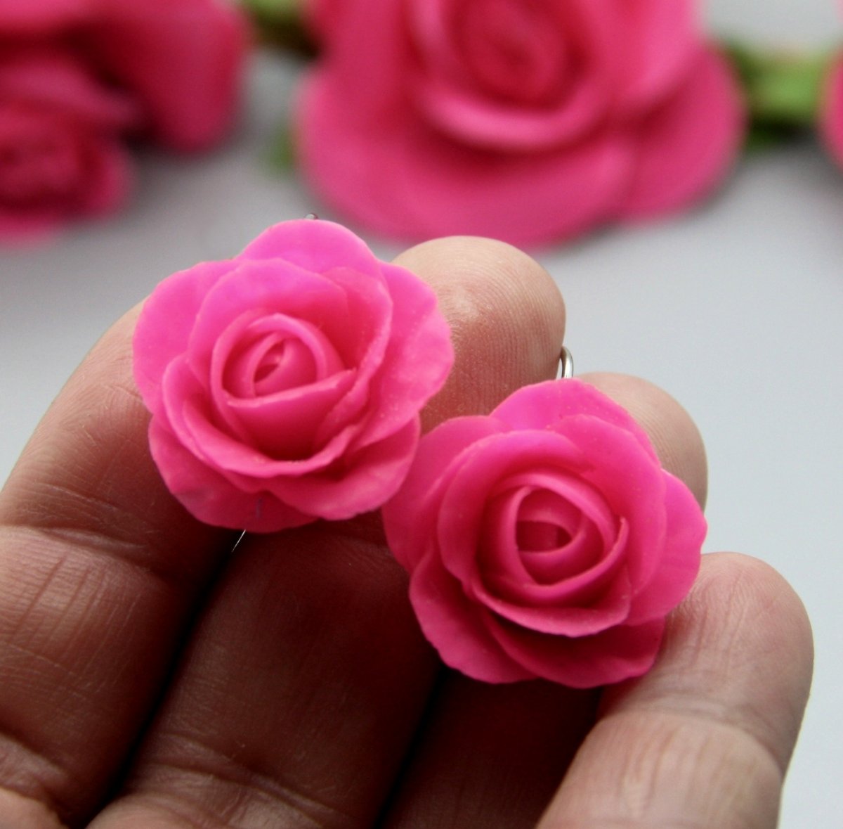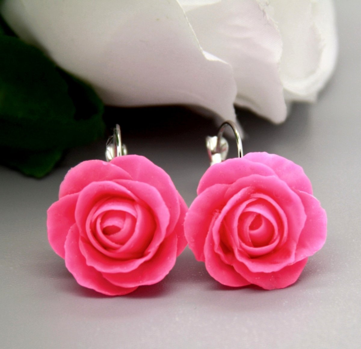 ručně modelovaný šperk z polymerové hmoty, barva růžová neonová, v detailu nafoceno pro představu velikosti a barvy,